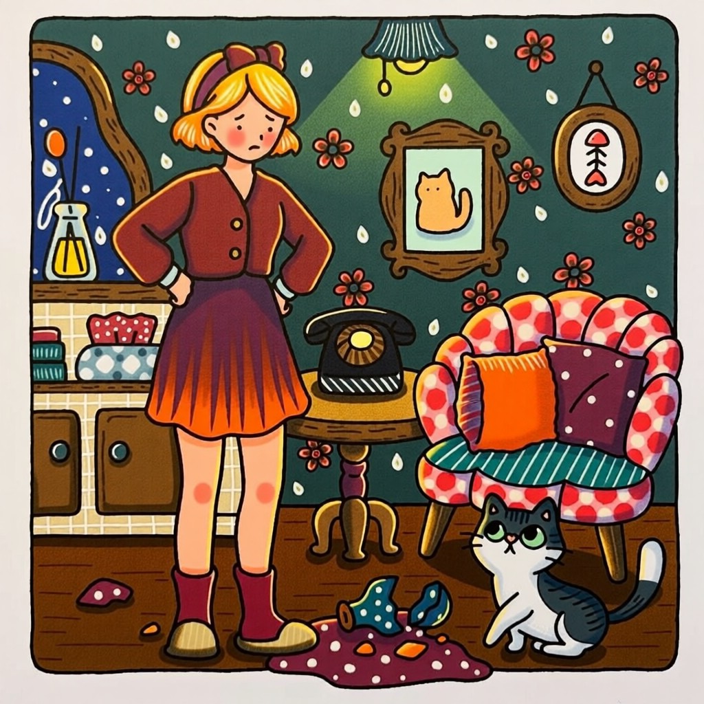 Once your base colors are in place, add shadows to give the room depth. Notice the light source—here, the lamp above the table casts a soft glow. Shadows appear beneath the girl’s skirt, behind the cat, and on the floor where the broken vase lies. Use darker versions of each base color for shadows and lighter tones or yellows for highlights.